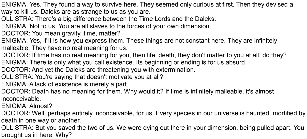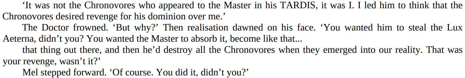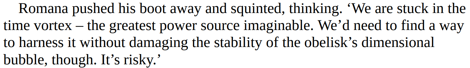 - Energy Absorption: It can refuel itself by draining ambient energy from virtually any source, including life-forces/Artron Energy, ideas, and anti-time, as well as normal temporal energy, and radiation.