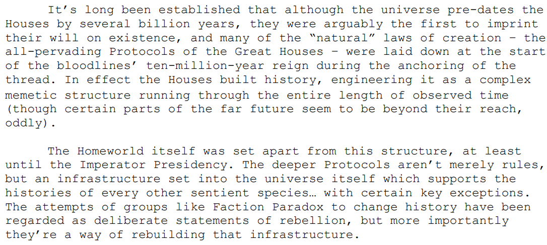 Also Nice I (https://vsbattles.fandom.com/wiki/User:Oliver_de_jesus) get mentioned here, i disagree with a few other stuff in DW cosmology (As the nature of Void´s incarnation being equate to Menti-celesti, I found evidence the Void lack time´s music and the Meta-time being... well more meta, more akind to meta-narrative) as well there is new stuff (for example; Monad/God with Capital G appear in Hidden truth: The Lost Fictionaut), kinda waiting for Lungbarrow by Loomlight, since i hear that it will be adventure during the pre-universe and see if it will change a lot things