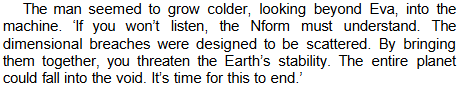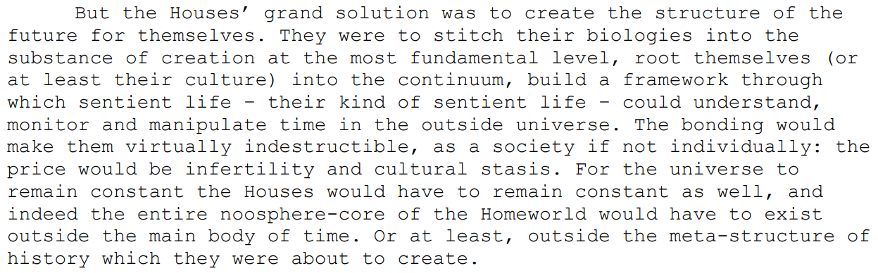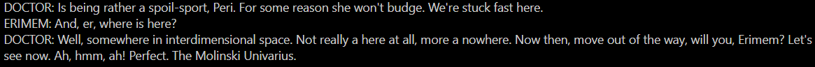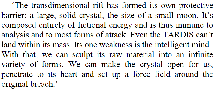 - Sealing/BFR: It can cast off sections of itself into the Void Between Universes, trap intruders in an endless maze/time loop, place targets in two time zones at the same time to rip them apart physically, trap intruders in forcefields and eject them, contained the Vashta Nerada, thrown objects into Hilbert Space, banished creatures back to their lower dimensions, collapse wormholes, and seal the Vortex Butterfly within a 5th dimensional prison planet.