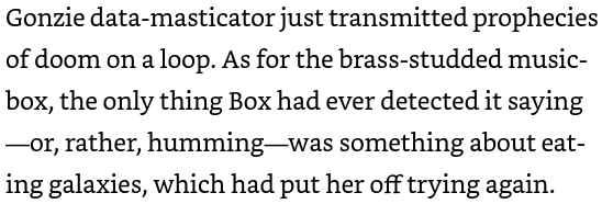 A Time Lord weapon, the Songbox can collapse infinite timelines around it in a chronal meltdown, create paradoxes that can rip the universe apart, and warp reality. The War Doctor would've used it to remove a race of higher-dimensional gods by manipulating the Collective Unconscious of an entire alien race, removing their belief and faith in higher powers and gods so to banish their Cyclor gods to a higher Nirvana, "deicide via ascension". He also used it to create the Then-And-The-Now alongside a Chronon Tracker, a hole in space-time. (See Support section for more details).