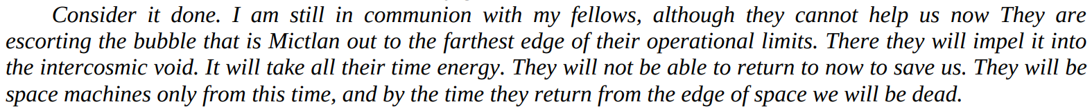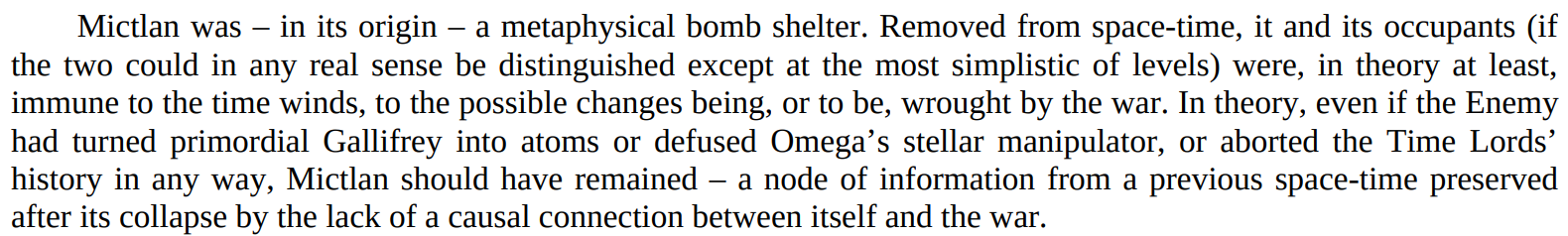 - Non-Physical Interaction/Conceptual Manipulation: The TARDIS worked in tandem with several WarTARDISes to sever Mictlan, a conceptual universe, from the main universe, while also damaging the Memeovore consuming it, a devourer of meaning and concepts. It has contained the Shift, another conceptual entity, and rewritten the "pure meaning" of biodata.