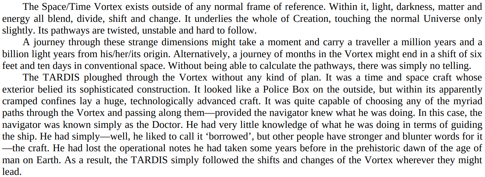 - Dimensional Travel: Thanks to its metaphysical engine, it can travel into potential futures, places outside of standard time or between time periods, higher planes of existence, simulated dreams, conceptual space, worlds of pure informational data, fictional universes within a book, the void of nothing between all universes, before the Big Bang, people's minds, alternate dimensions, sentient minds, the Astral Plane within the Vortex, and areas out of sync with time. It was originally capable of easily travelling across the entire omniverse before the Time War sealed the barriers between universes, though it has managed to do this repeatedly even after the war.
