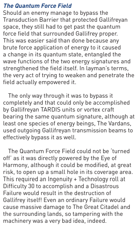 - Phasing and Power Negation: The TARDIS can phase through matter, land in the Nihilism Chamber cut off from all outside sources, bypass virtually every barrier of every conceivable concept and "then a bit further", and get through Gallifrey's Transduction Barriers, which warp all 11 layers of space-time; the first barrier can tear apart atoms, while the others attack on a conceptual level and the quantum barrier is strengthened by any attack against it
