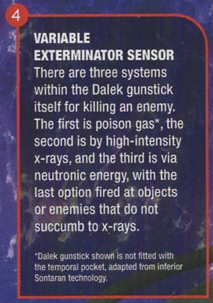Current Dalek gunsticks are particle beams, which are a step up from disruptors, which can break down the cohesion of matter. The typical gunstick has three standard settings, allowing for the firing of poison gas, high intensity X-rays, and neutronic energy. The gunstick possesses electrical properties, allowing its energy to travel through water and metal to electrocute groups of enemies. At full power, the gunstick can atomise humans and generate enough energy to light up New York for a year, but the setting can be reduced to temporalily induce paralysis, stun targets, or changed to fire cryo-spray. It has also destroyed Dalek armour on occasion, up to entire squadrons being one-shot, despite said armour possessing self-repair abilities.