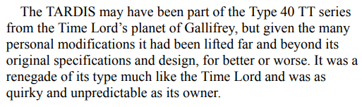 Shabby blue police box on the outside, incredible time machine on the inside, the TARDIS (Time And Relative Dimension In Space), is a dimensionally transcendent and infinitely large and layered space-time surpassing entity, existing as a timeless, eternal, and uncreated vessel. While the Type 40 that the Doctor stole from Gallifrey was outdated long before his first known regeneration took place, the Doctor has upgraded it constantly throughout its travels, enabling it to match and surpass far more advanced models.- Temporal Grace: The Temporal Grace exists to prevent any violence from occurring within the TARDIS, disabling weapons, nullifying powers, and immobilizing targets within stasis fields, even Elder Gods like Eidolon. It also acts to hold its occupants together against the worst damage, even stretching out time to turn seconds outside into minutes inside and protect the exterior from damage, giving the occupants more time to plan.