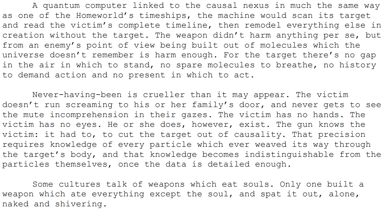 One of the most feared weapons of the Time Lords, the De-materialization Gun is a weapon held in reserve for only the most desperate situations. To use the weapon is to do far more than kill an opponent. Upon hitting a target, the gun analyses the target's timeline and sends the information to a quantum computer that then remodels all of creation to not include the target. To be "built out molecules the universe doesn't remember is harm enough..... there's no gap in the air to stand, no spare molecules to breathe, no history to demand action and no present in which to act..... The victim has no hands. The victim has no eyes....Some cultures talk of weapons that eat the soul. Only one built a weapon that ate everything except the soul, and spat it out, alone, naked, and shivering."
